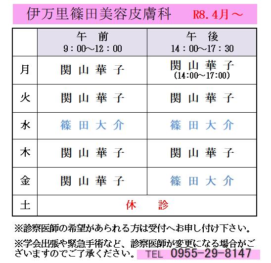 R8年4月1日より美容皮膚科の診療日、休診日が変わります